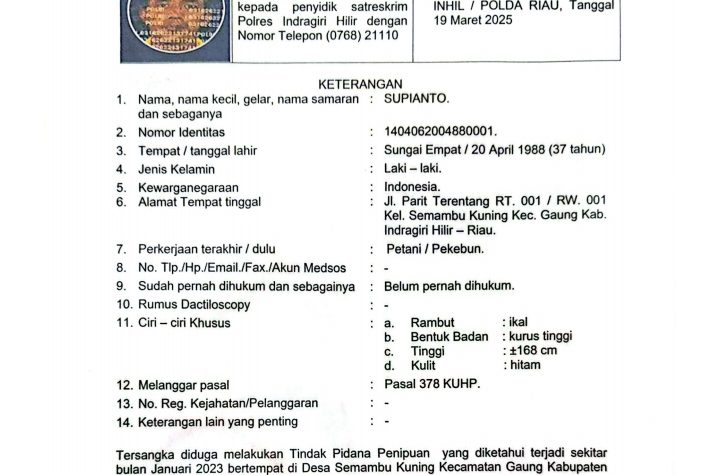 Polres Indragiri Hilir Terbitkan DPO Terhadap Tersangka Kasus Penipuan Lahan DI Desa Semambu Kuning.