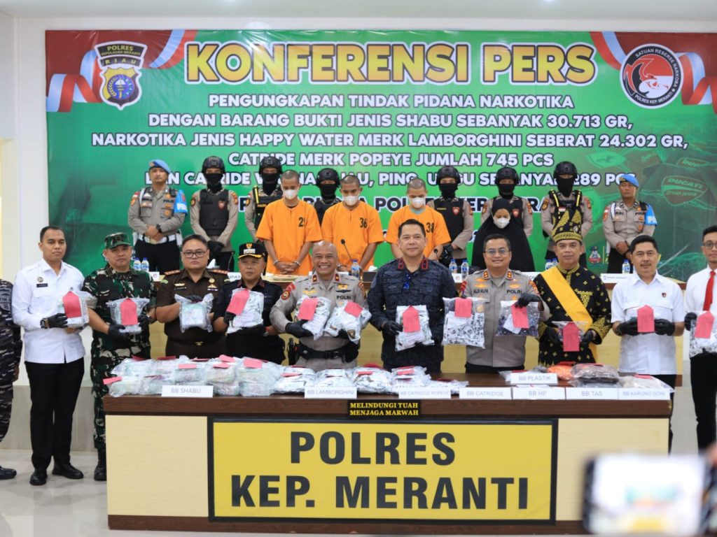Lidik24jam. MERANTI – Kepolisian Resor (Polres) Kepulauan Meranti berhasil menggagalkan upaya penyelundupan narkotika jenis sabu seberat 30,7 kilogram, cairan ‘Happy Water’ sebanyak 24,3 kilogram, serta 1.034 bungkus catridge liquid narkotika berbagai merek seperti Popeye, Pink, Hijau, Ungu, dan Lamborghini.