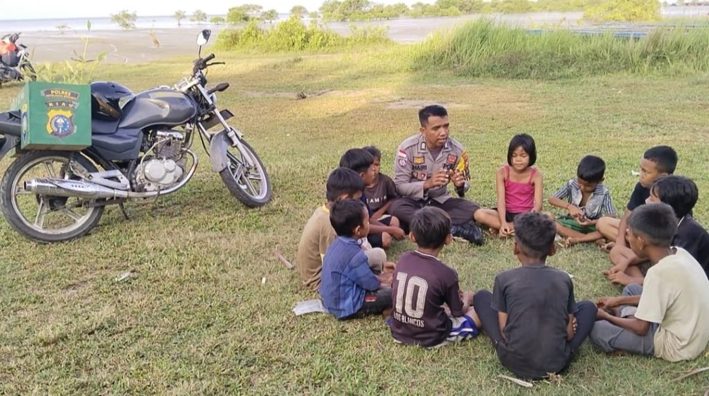 Lidik24jam. Meranti – Dengan langkah mantap di atas pantai berlumpur, Bhabinkamtibmas Desa Sendaur dan Desa Kayu Ara, Polsek Rangsang, Polres Kepulauan Meranti, Brigadir Khairi, mengajak anak-anak Suku Akit menanam puluhan bibit pohon mangrove di kawasan Pantai Gelombang Cinta, Kecamatan Rangsang Pesisir, Kamis (23/10/2025) pagi.