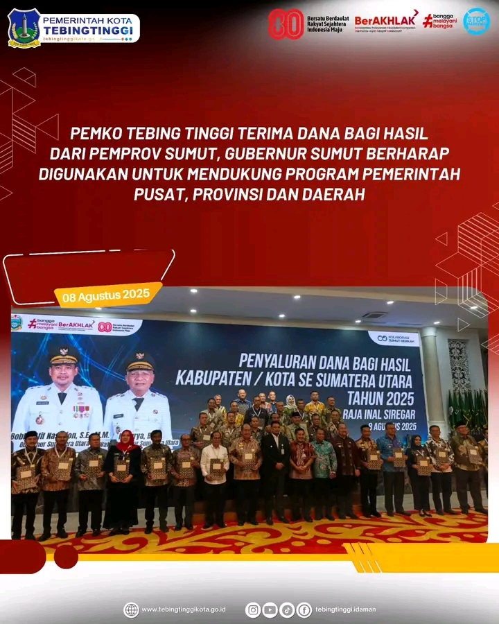 Adapun penyaluran Dana Bagi Hasil Tahun 2025 oleh Pemprov Sumut kepada Pemko Tebing Tinggi sebesar Rp 4.191.430.975 (Empat Miliar Seratus Sembilan Puluh Satu Juta Empat Ratus Tiga Puluh Ribu Sembilan Ratus Tujuh Puluh Lima Rupiah).